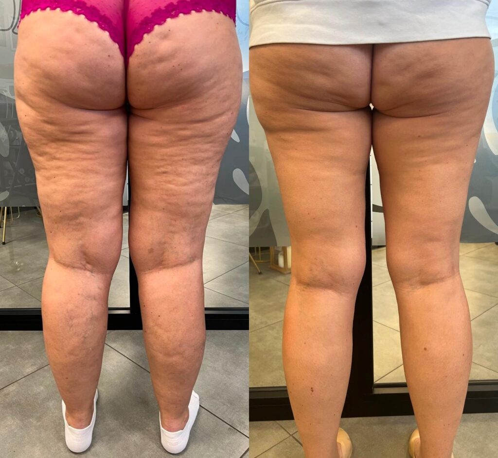 Pierwsze efekty widać już po 1 zabiegu — skóra jest gładsza, a obwód może być mniejszy o pierwsze centymetry. Najlepsze rezultaty daje seria.